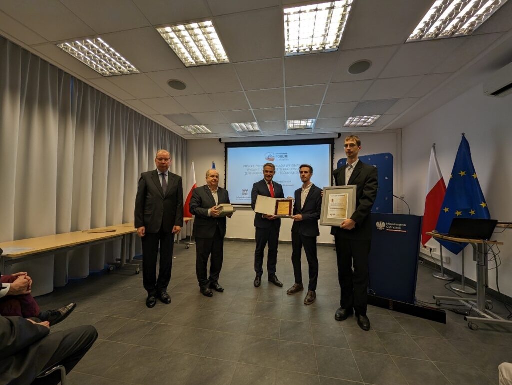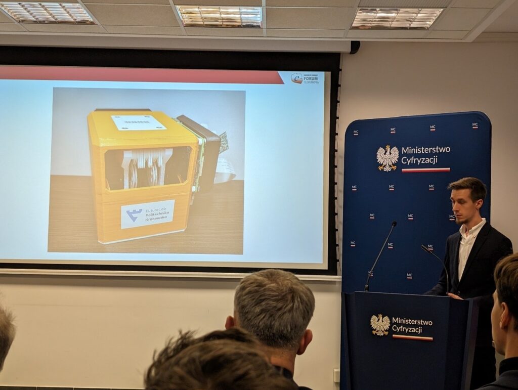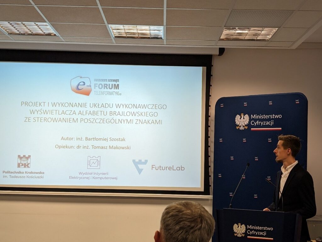 Wspierany przez FutureLab student Infotroniki na Politechnice Krakowskiej – inż. Bartłomiej Szostak z WIEiK odebrał dziś (7.03.2024) nagrodę za pracę pt.: „Projekt i wykonanie układu wykonawczego wyświetlacza alfabetu brajlowskiego ze sterowaniem poszczególnymi znakami” w kategorii „Najlepsza praca z zakresu społecznych skutków informatyzacji” w Ogólnopolskim, Międzyuczelnianym Konkursie Młodych Mistrzów w gmachu Ministerstwa Cyfryzacji. Jest to podwójne wyróżnienie, ponieważ Dyplom Nagrody Specjalnej wręczał sam minister cyfryzacji – wicepremier Krzysztof Gawkowski. Wraz z Ministrem nagrodę wręczyli Witold Wieteska (Przewodniczący Jury Konkursu Młodych Mistrzów) oraz prof. WAT Bolesław Szafrański (Przewodniczący Rady Programowej Forum Teleinformatyki).