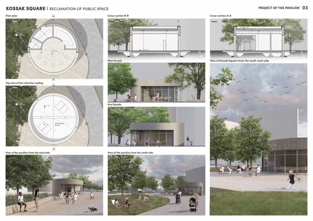 W projekcie nie brakuje też praktycznych rozwiązań: ogrody deszczowe, studnie chłonne i zrównoważone gospodarowanie wodami opadowymi to odpowiedź na wyzwania współczesnych miast. Zaplanowany pawilon kawiarniany mógłby stać się miejscem spotkań i chwil wytchnienia w intensywnym centrum Krakowa.