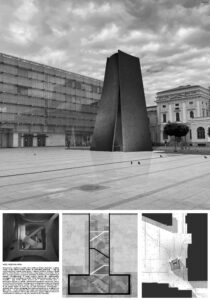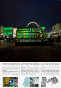 Nagrodzone projekty prezentują trzy zupełnie różne, a zarazem wyjątkowo dojrzałe wizje tego, jak mogłoby wyglądać wejście do stacji metra „Dworzec Główny”. Anna Bryksy zaproponowała monumentalną rzeźbiarską formę – klin z surowego materiału, inspirowany brutalizmem i minimalizmem, który staje się nie tylko punktem dostępu do komunikacji, ale też symboliczną bramą i miejskim znakiem tożsamości. Jan Meres sięgnął po krakowską tradycję witrażownictwa, tworząc ażurową strukturę ze szkła barwionego w masie i stali nierdzewnej, reagującą na światło i otoczenie – funkcjonalną, ale też poetycką instalację publiczną. Z kolei Katarzyna Półchłopek zaprojektowała lekką, organiczną konstrukcję zadaszenia w odcieniu błękitu, inspirowaną logo Krakowa – nowoczesną formę architektury parametrycznej, która łączy estetykę z użytecznością i z każdej strony przypomina literę „M”, stając się współczesnym symbolem miejskim.