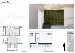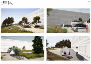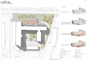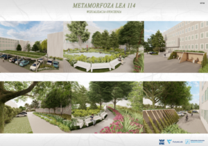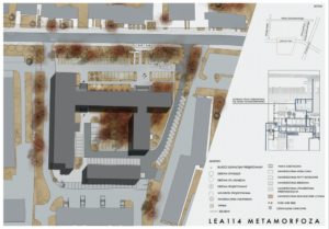 Zagospodarowanie terenu. Koncepcja urbanistyczno-architektoniczna zakłada przebudowę wewnętrznego układu komunikacyjnego wraz ze zmianą lokalizacji zjazdu z drogi publicznej – ul. Lea. W miejscu obecnego zjazdu planuje się zatoczkę użytkowaną w formule K+R, udostępnioną również dla pojazdów kurierów. Dzięki zmianie lokalizacji wjazdu plac przed budynkiem – mimo, że nadal pełni funkcję parkingu – można w części wykorzystać na strefy wypoczynku/relaksu, zwiększyć powierzchnię biologicznie czynną bezpośrednio przy budynku oraz umożliwić pieszym bezpieczne dojście. Chodnik na wprost wejścia do budynku zostaje utrzymany.